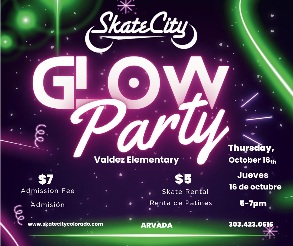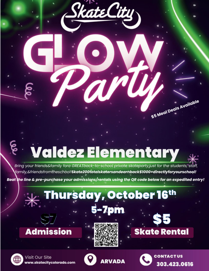 Oct 16, 5-7pm: Skate City Night for All Valdez Students at Skate City Arvada / Noche de Skate City para todos los estudiantes de Valdez en Skate City Arvada