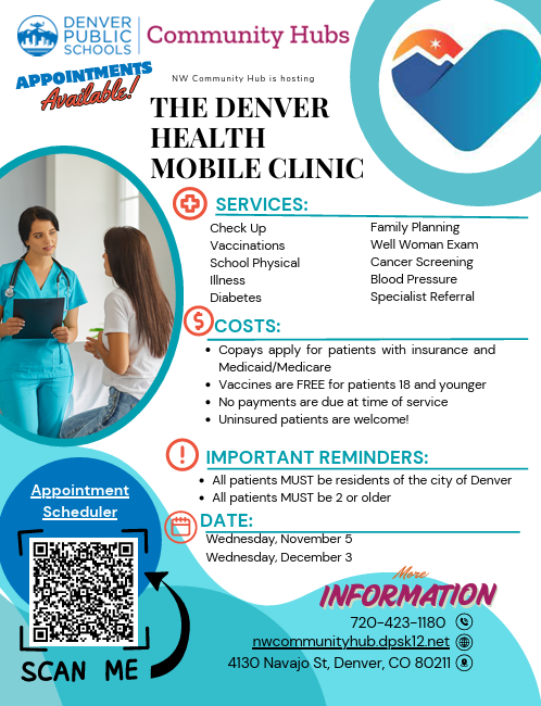 The Denver Health Mobile Clinic will be on site at the NW Community Hub at Trevista Elementary. Appointments are available on Wednesday, November 5th and Wednesday, December 3rd. Please click HERE to make an appointment.