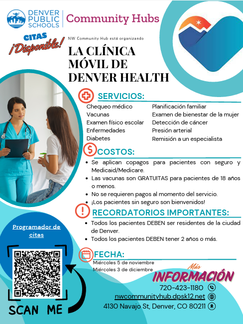 La Clínica Móvil de Denver Health estará en el Centro Comunitario del Noroeste de la Escuela Primaria Trevista. Hay citas disponibles los miércoles 5 de noviembre y 3 de diciembre. Por favor haga clic AQUÍ para hacer una cita.