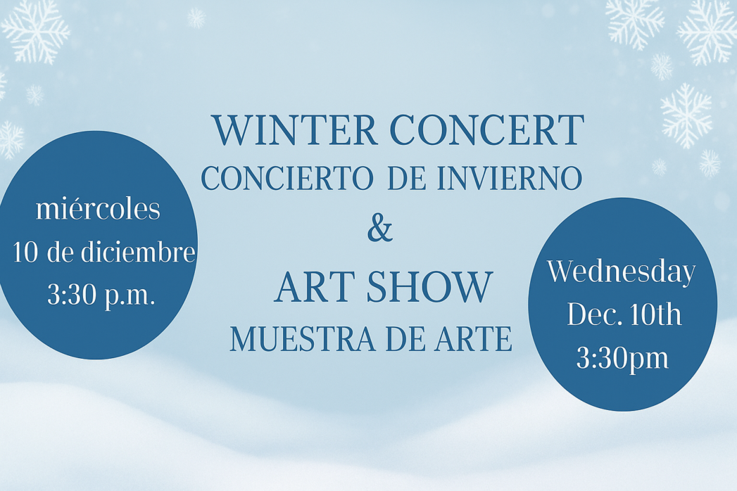 ¡Todas las familias están invitadas! Todos los grados tendrán arte en exhibición. Las familias de Kinder y 5º grado: sus estudiantes estarán cantando. Más detalles próximamente.