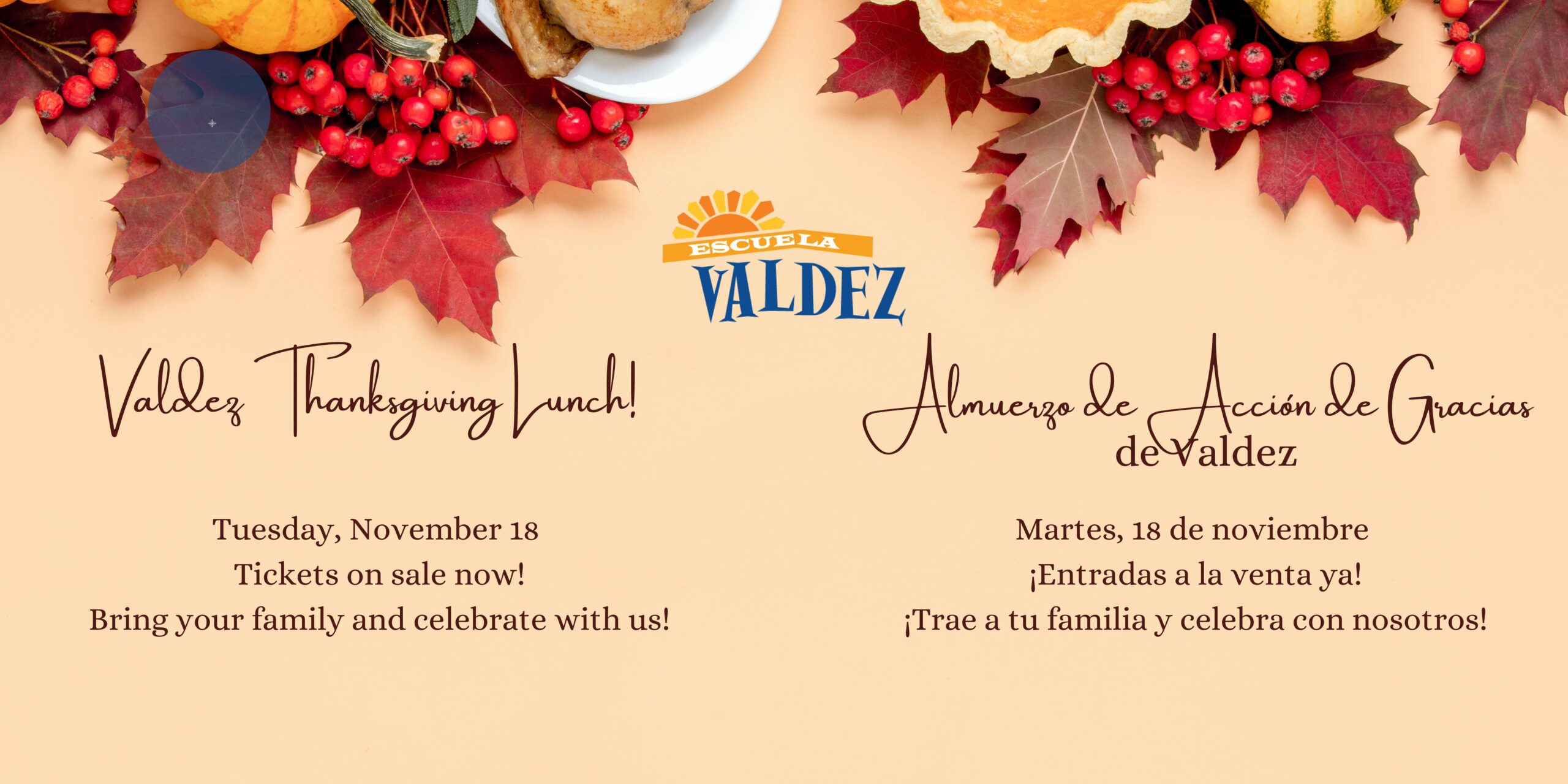 Estaremos celebrando nuestro almuerzo de Acción de Gracias en Valdez el martes 18 de noviembre. ¡Tickets a la venta ya! $7 adultos, $6 niños no estudiantes de Valdez.