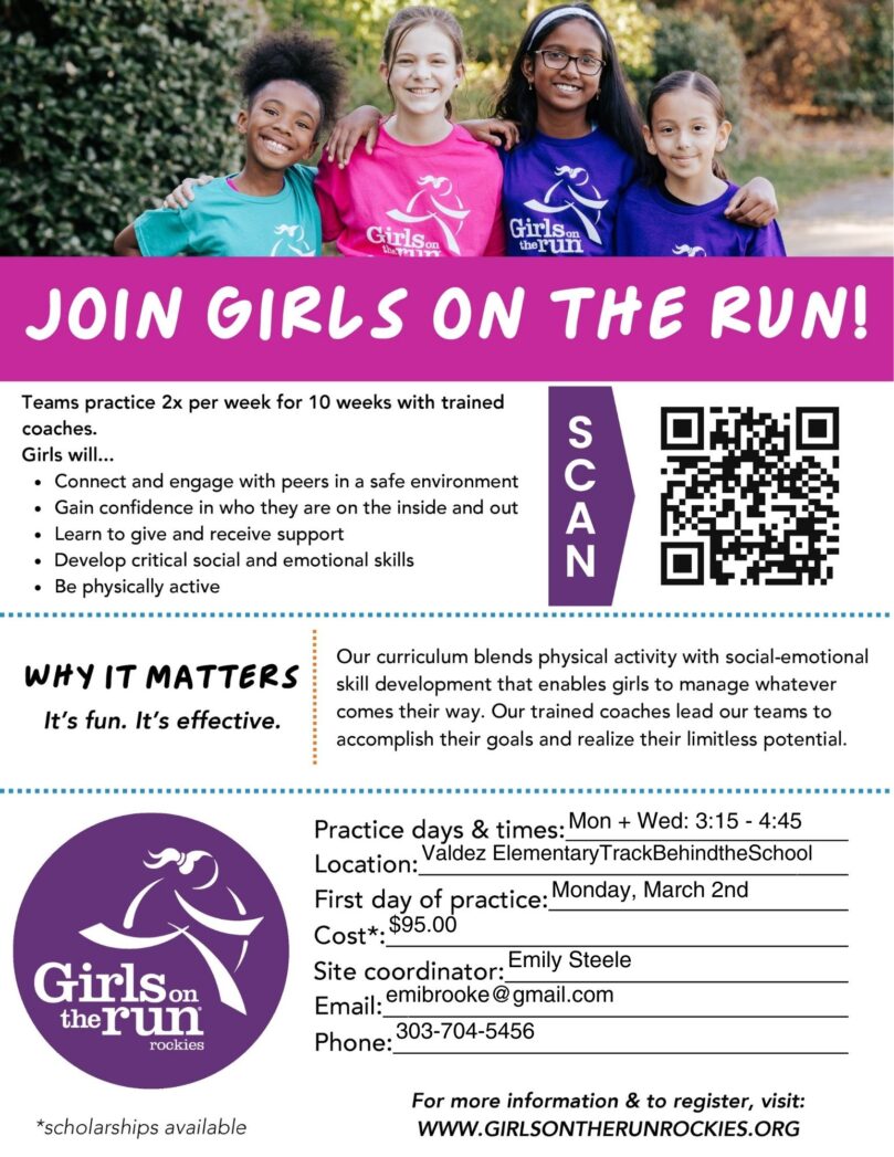 Abierto a todas las niñas de 3er, 4to, 5to grado. La inscripción se abre el 2 de febrero. Para más información sobre el programa visite www.girlsontherunrockies.org/es/. ¿Tienes preguntas o quieres entrenar? Pregunte Emily Steele, emibrooke@gmail.com.