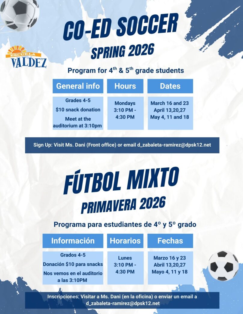 Estamos emocionados de anunciar una nueva oportunidad para nuestros estudiantes! Tendremos un programa de soccer coed para estudiantes de 4º y 5º grado, dirigido por dos padres voluntarios de nuestra escuela.